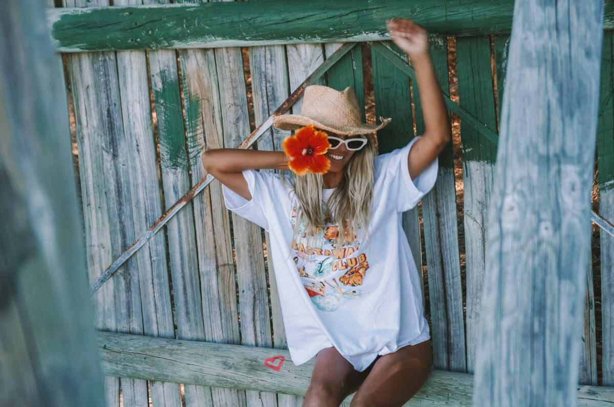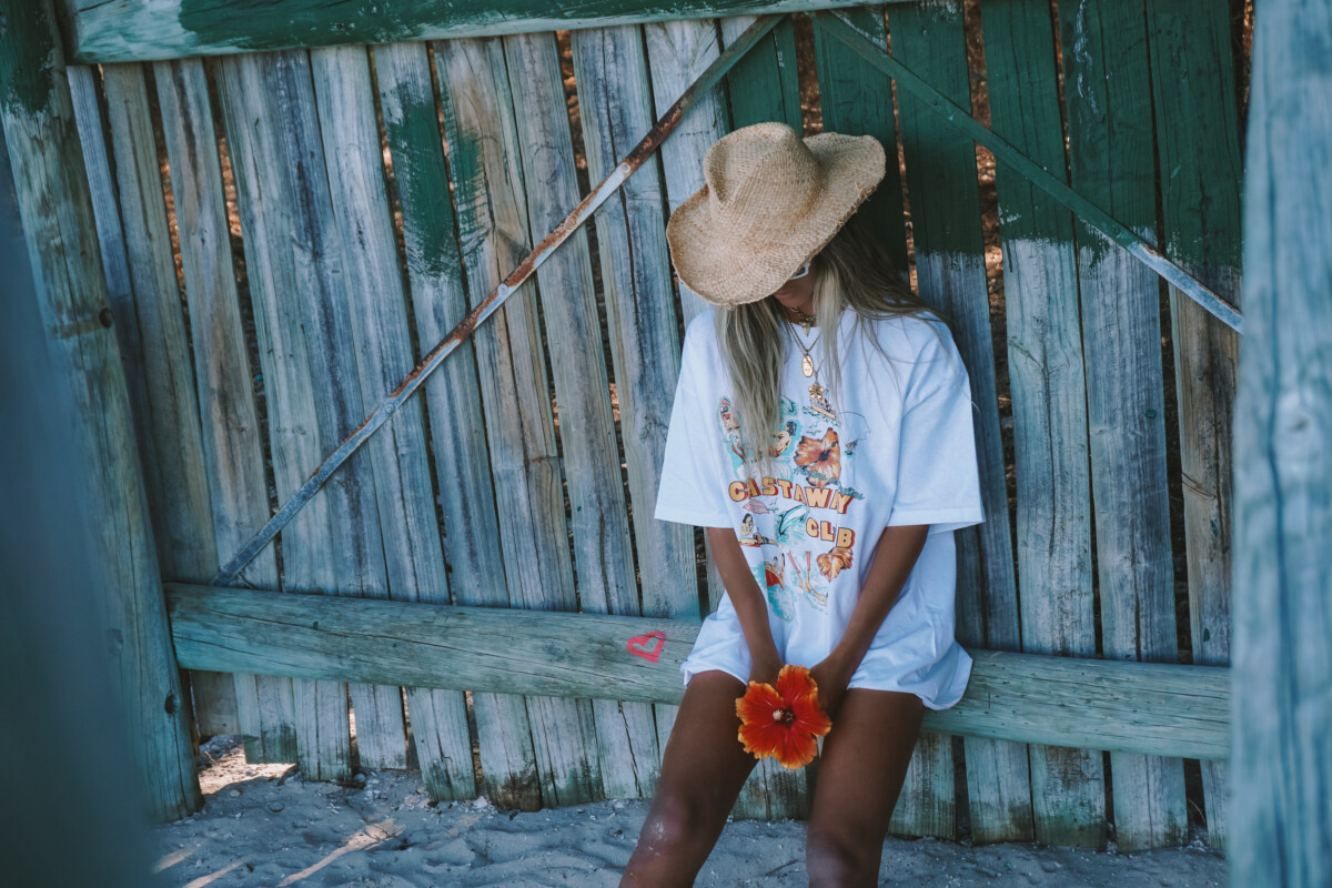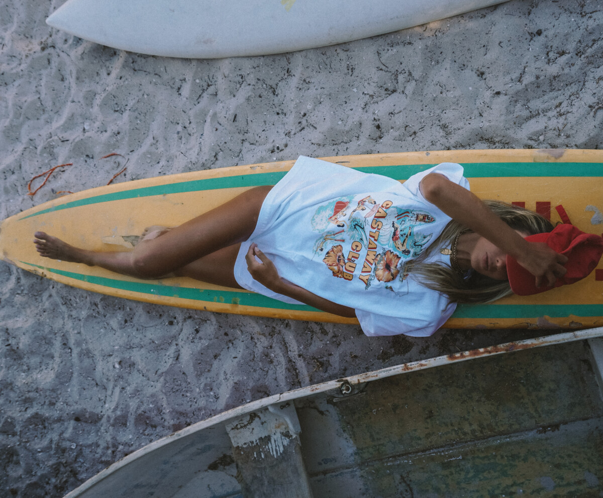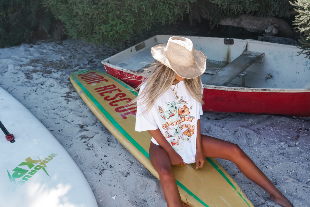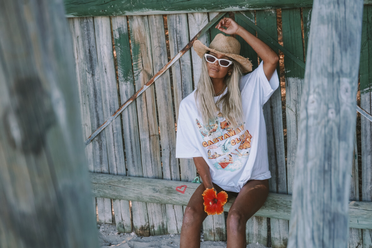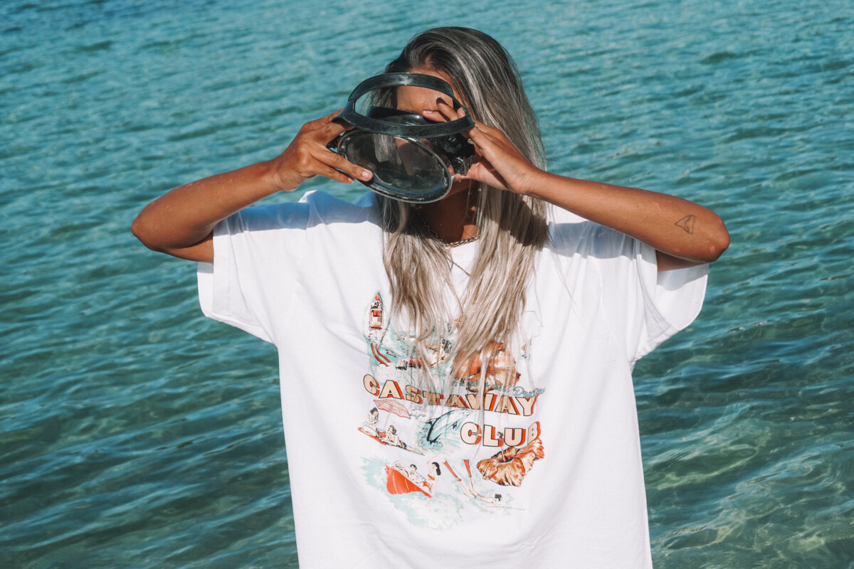Our Castaway Club Front Print Tee was created and designed by Britta as a perfect oversized Tee for the ladies to throw on as a stunning beach cover up. This Tee is built to last with beautiful 100% US Cotton at 200 GSM. A boxy oversized fit with dropped shoulders, medium neck ribbing, side seams, shoulder to shoulder tape, and double needle hems ensure durability and comfort. The Castaway Club design is hand drawn and created by Britta and is super detailed and impressive.