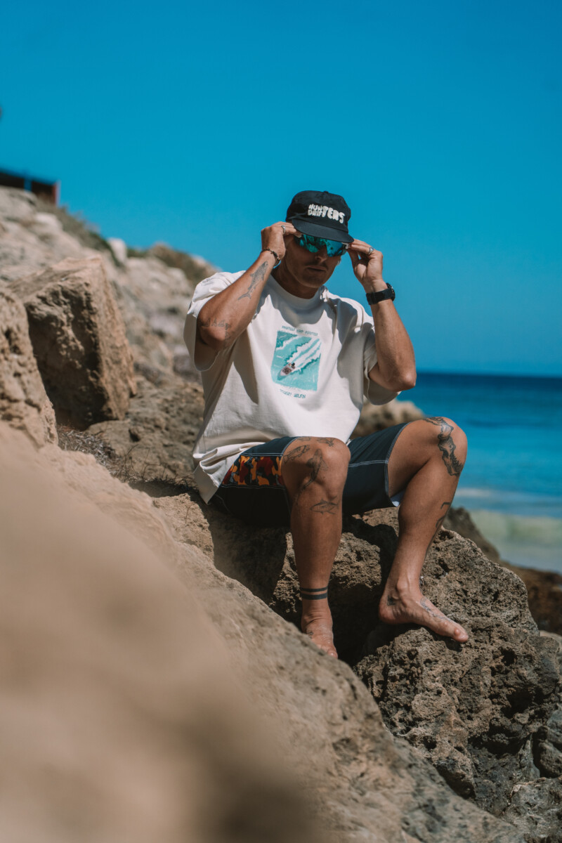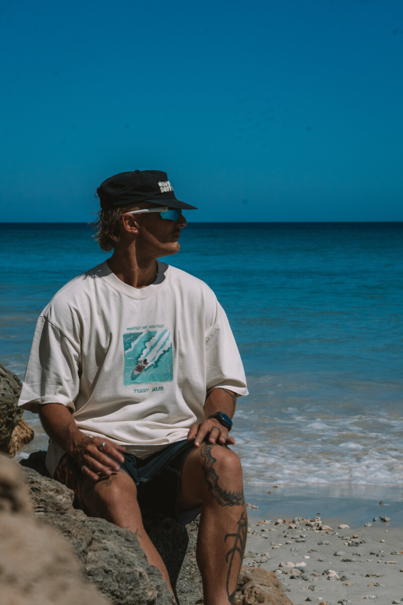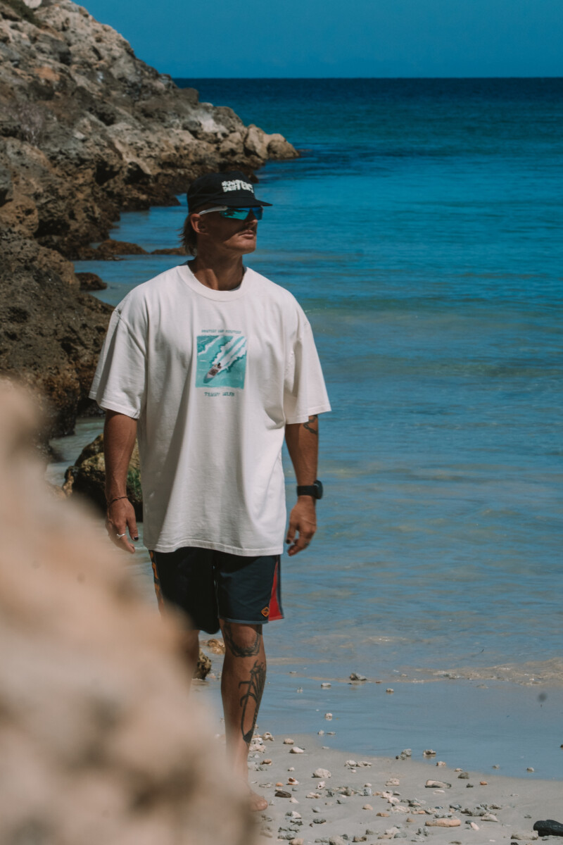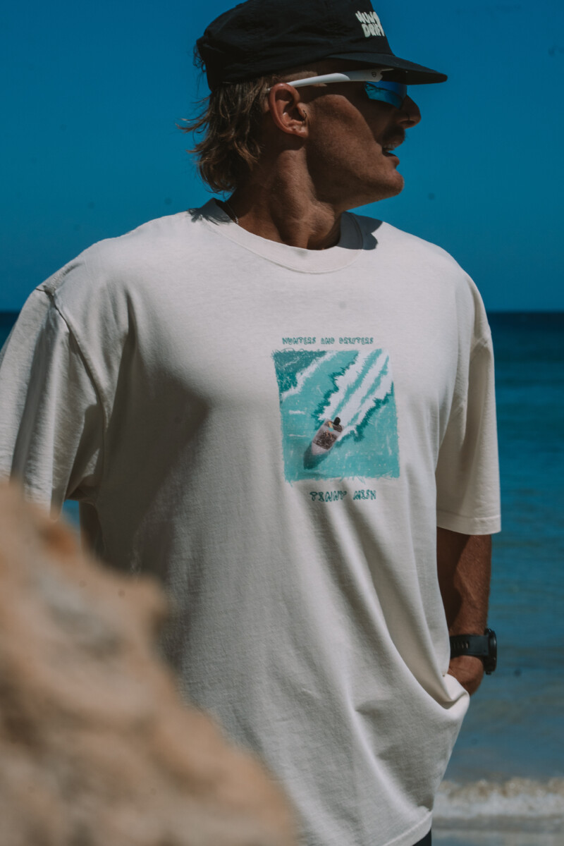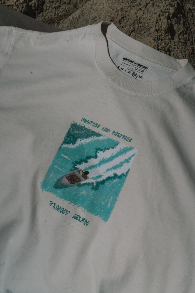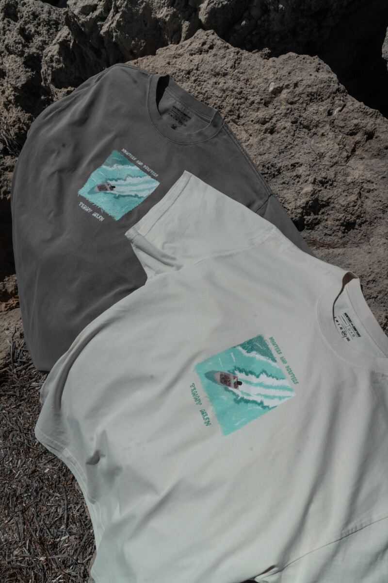 Our Hunters Tinny Fish is built to last with heavy weight 240 GSM 100% cotton. A boxy oversized fit with dropped shoulders, wide neck ribbing, side seams, shoulder to shoulder tape, and double needle hems ensure durability and comfort. The Tinny Mish design is hand drawn and created by Britta.
